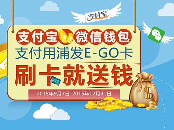 支付宝&微信钱包浦发E-GO卡首次支付,送10元刷卡金